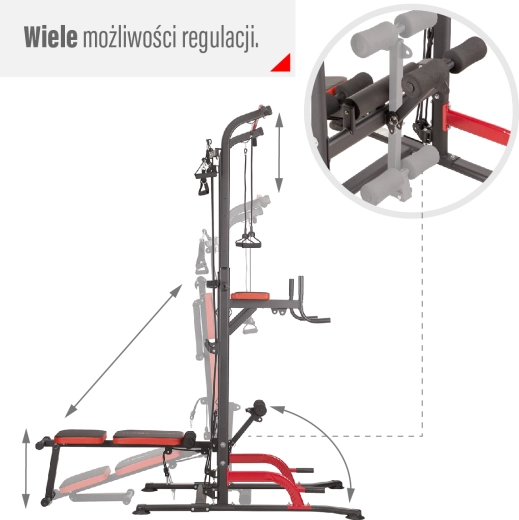 De boven- en onderkatrollen werken met twee paar rubberen kabels met karabiners, waarvan de weerstand kan worden gecombineerd en aangespannen via ogen in het frame. Alle grepen hebben een antislipopervlak voor een zekere grip en stabiliteit bij zware sets. De optrekstang is verstelbaar tot een hoogte van 232 cm en de bank kan eenvoudig worden ingeklapt voor ruimtebesparing.