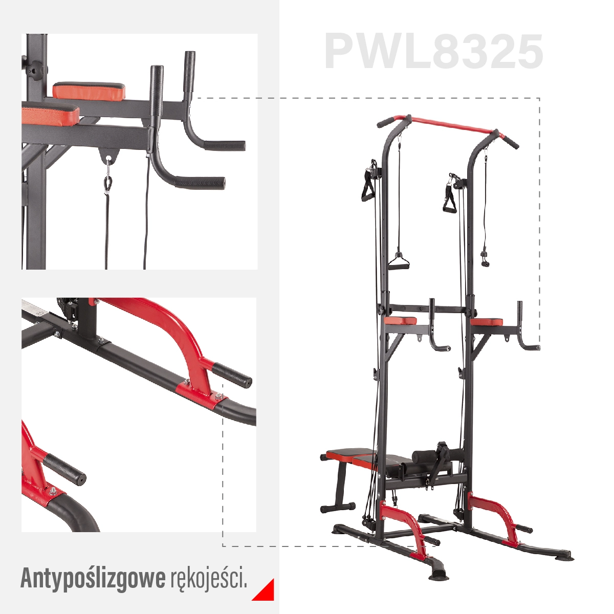 - 5-in-1: optrekstang, dipstation, bank, boven- en onderkatrol
