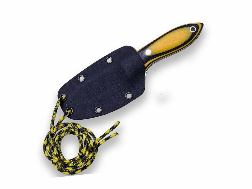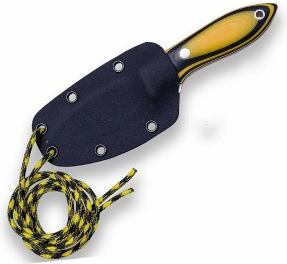 De ergonomische handgreep van Micarta in zwart‑oranje combinatie ligt uitstekend in de hand, ook bij vocht. Het oog aan het uiteinde van de handgreep maakt het mogelijk een koord door te halen. De Kydex schede met paracord (1,3 m) maakt discreet en veilig dragen aan de hals of aan de uitrusting mogelijk – een perfecte keuze voor bushcraft, kamperen en dagelijks dragen (EDC).