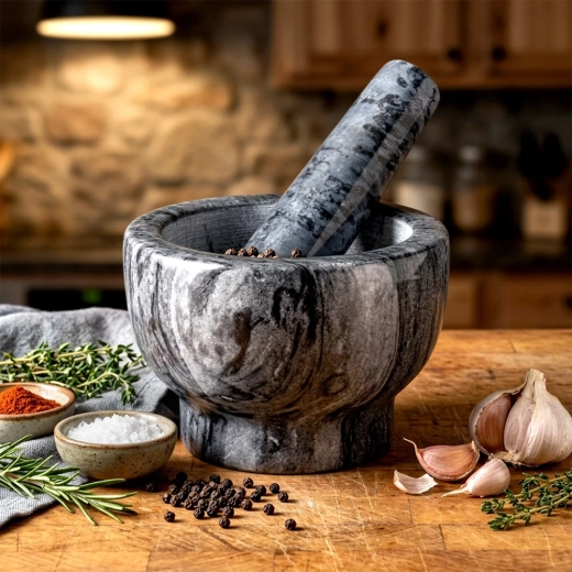 Dankzij de massieve, zware constructie is de vijzel stabiel en glijdt hij tijdens het werken niet. Reinigen gaat eenvoudig – gewoon met water afspoelen en drogen. De steen is duurzaam en neemt geen geuren op, waardoor hij hygiënisch en langdurig mooi blijft. Elk stuk is uniek en kan variëren in nerf en tint.