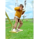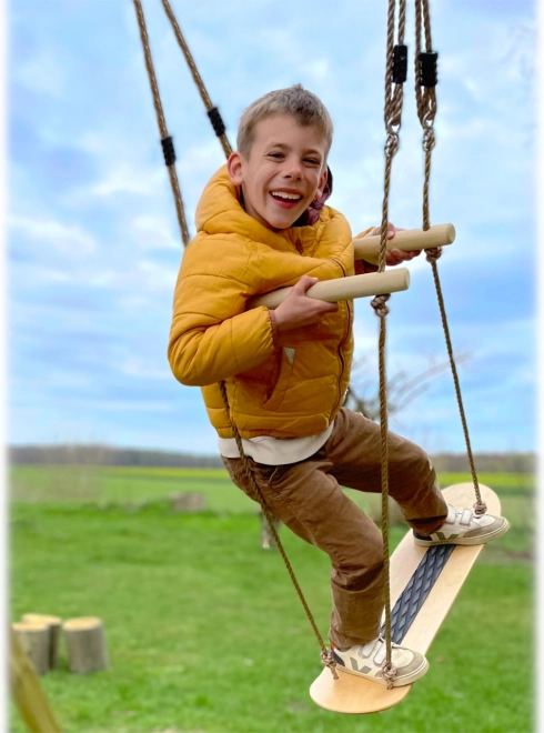 Robuuste houten handgrepen aan de touwen schuif je eenvoudig naar de ideale hoogte. Ze bieden steun bij het opstappen en bij staand schommelen.