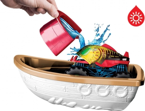 De set is ontworpen voor spannend, creatief en schoon spel: de ramp met bord daagt uit tot precieze sprongen, terwijl de uitneembare boot en het reservoir het water uitsluitend in de speelzone houden. Ideaal voor kinderen die dol zijn op MONSTER TRUCKS, stuntactions en kleurrijke transformaties.