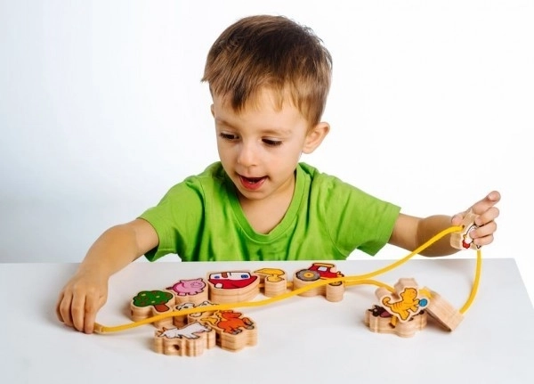 Het rijgen van verschillende vormen helpt kinderen de hand-oogcoördinatie te verbeteren.