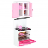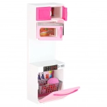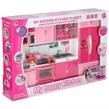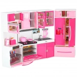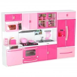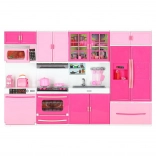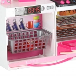 Stijlvolle roze-witte poppenkeuken bestaande uit vier modules met LED-verlichte kookplaten en geluidseffecten. Voorzien van openende deurtjes, magnetron, oven, vaatwasser, koelkast en gootsteen, plus rijk accessoireset voor realistisch kookspel en keukenorganisatie.