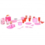 In de verpakking zit een rijk accessoireset: pannen met deksels, koekenpan, broodrooster met beweegbare hendel, servies, mokken, bekers, een “melkpak”, keukengerei aan haakjes en “ijsklontjes”. Openende kastjes, een uittreklade en planken leren kinderen orde houden en ontwikkelen de fijne motoriek en sociale vaardigheden.