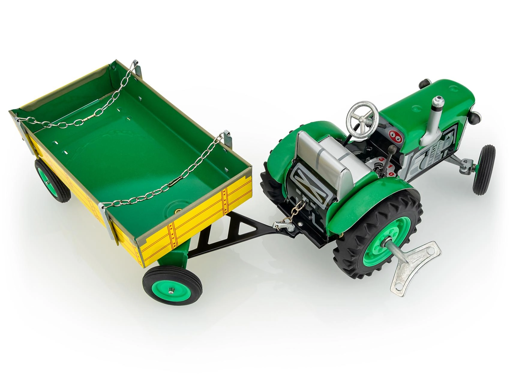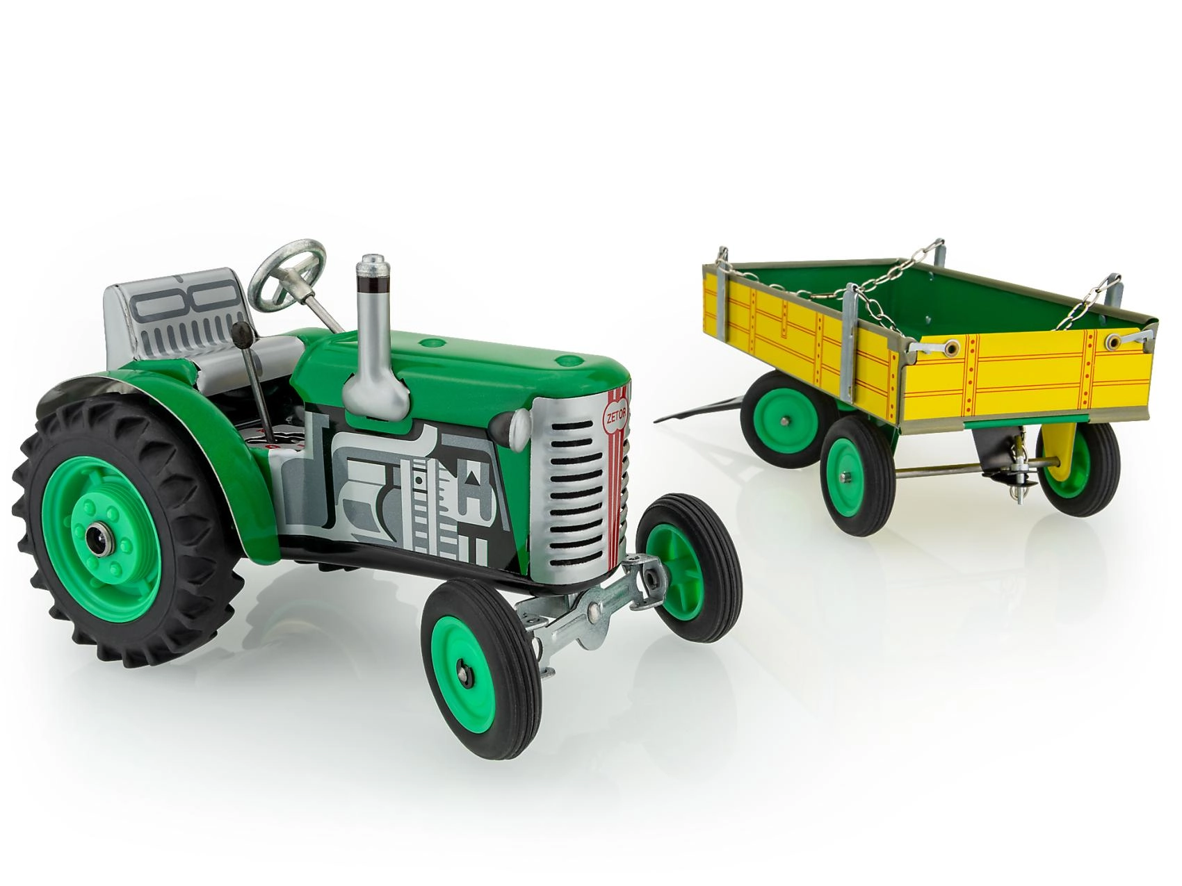 De metalen Zetor-tractor met aanhanger van het merk KOVAP maakt zowel kleine als grote fans van landbouwtechniek blij. De aandrijving wordt verzorgd door een opwindmechanisme met sleutel, met een werkende versnellingsbak met 3 versnellingen vooruit en achteruit, sturing via het stuur en een handrem. In schaal 1:25 en met een lengte van 28 cm biedt hij een authentieke rijervaring én verzamelwaarde.