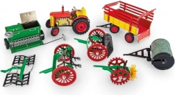 De set bevat een Zetor tractor met plastic wielen en een mechanisch veersysteem dat met een sleutel opgewonden wordt. Het biedt drie verschillende snelheden vooruit, één snelheid achteruit, neutrale stand en een handrem. De accessoires omvatten: