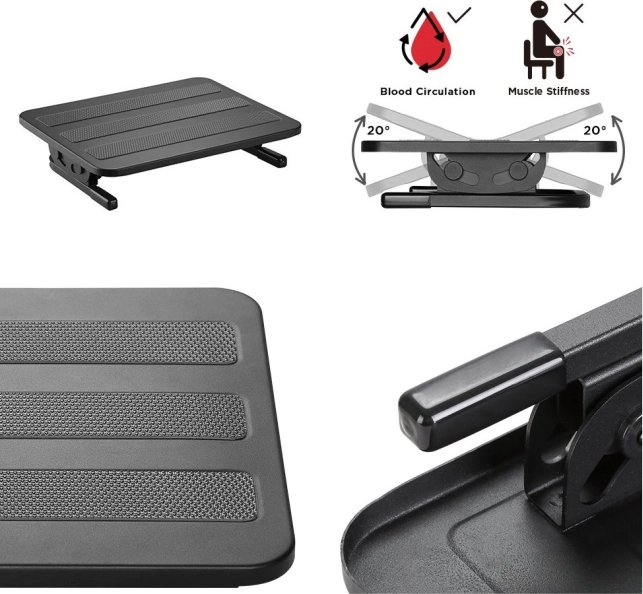 De ergonomische voetensteun MACLEAN MC-831 met stevige metalen constructie biedt traploze kantelverstelling in het bereik van +20° / -20° en drie antislipstroken voor een stabiele ondersteuning. Dankzij het royale oppervlak van 380 × 300 mm verbetert hij de ergonomie van het zitten, verlicht hij de rug en ondersteunt hij een betere bloedcirculatie tijdens langdurig zitten op kantoor of aan de computer.