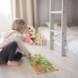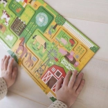 Ontdek de wereld van de boerderij met een creatief set dat puzzelen en een leuk zoekspel combineert. Na het leggen van de lange puzzel volgen kinderen de paadjes met hun vinger, trainen ze de oog-handcoördinatie en zoeken ze ondertussen 20 objecten op de afbeelding. Ideale activiteit voor samen met kinderen of voor zelfstandig spel.