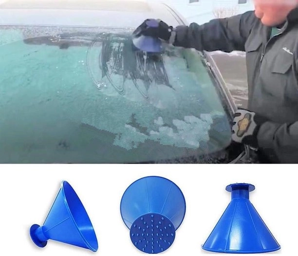 Praktische en duurzame magische 2-in-1 ijskrabber voor het snel reinigen van autoruiten. Dankzij de kegelvorm en brede basis verwijdert hij effectief rijp en zelfs een dikke ijslaag. Het bovenste deel kan worden gebruikt als trechter – ideaal voor het bijvullen van vloeistoffen. Snel krabben, universeel 2-in-1, stevig kunststof, comfortabele grip.