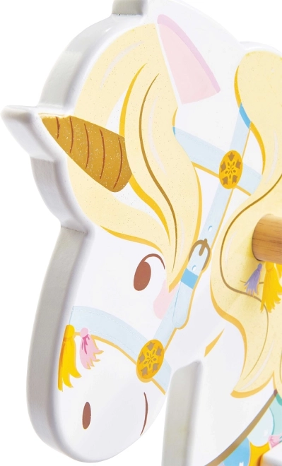 Een betoverende houten schommelende eenhoorn in kermisstijl die elk peuterhart verovert. Biedt een zachte schommelbeweging, bevordert balans en motoriek en is veilig dankzij een stabiele basis, handgrepen en voetsteunen. Gemaakt van duurzaam hout en beschilderd met niet-giftige verf op waterbasis.