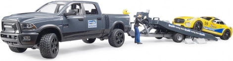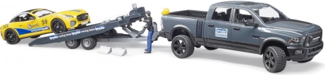 Geniet van actievol transport en een race-achtige sfeer met de gedetailleerde set van BRUDER: RAM terreinpick-up met aanhanger, gele sportwagen en chauffeurfiguurtje. Het model op schaal 1:16 biedt openende deuren, een afneembaar dak bij de sportwagen, besturing met een extra stuur en compatibiliteit met BWORLD-figuren voor nog meer speelmogelijkheden.
