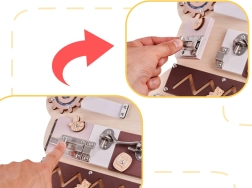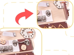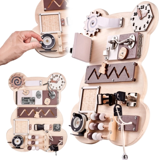 Om ervoor te zorgen dat het sensorisch bord de aandacht van het kind trekt en hem aanmoedigt om te spelen, heeft het bord de vorm van een schattige teddybeer en de gebruikte kleuren zijn aangenaam en aantrekkelijk voor het oog! Het bord bevat veel elementen, van de eenvoudigste activiteiten, zoals het bewegen van kralen op een telraam, tot de meer complexe, zoals het openen van een slot met een sleutel!