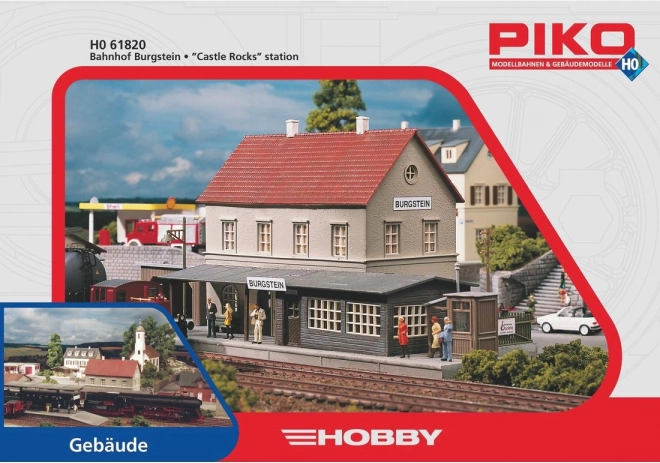 Bouwpakket van het Burgstein station van PIKO HOBBY, een gedetailleerd uitgewerkte gebouwset in schaal H0 (1:87) met realistische kleurstelling. Biedt eenvoudige montage, tal van fijne details en uitbreidingsmogelijkheden met perrons, seinhuizen, locloodsen of opslagloodsen voor een complete modelweergave van een kleine stadsspoorstationsomgeving.