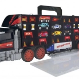 De enorme vrachtwagenkoffer combineert een opbergbox en een speelset in één. De openklapbare compartimenten bieden plaats aan de volledige set voertuigen en accessoires, en de praktische handgreep maakt dragen eenvoudig. Het handmatige lanceermechanisme in de cabine verandert de vrachtwagen in een racebaan en zorgt voor actievolle starts.
