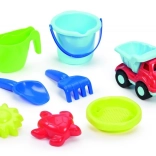 Deze kleurrijke zandset biedt alles wat kinderen nodig hebben voor creatief spel in de zandbak of bij het water. De lichte kar met lange handgreep en stabiele wielen vervoert moeiteloos het emmertje, de gieter en andere accessoires. Duurzaam kunststof en veilige vormen zorgen voor comfortabel en zorgeloos spelen, of je nu een zandkasteel bouwt of lading vervoert in de kiepwagen.