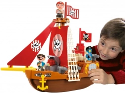 Het schip is uitgerust met gedetailleerde onderdelen, zoals rode zeilen met een schedel- en gekruiste-bottenmotief, die kinderen een authentieke piratenervaring bieden.