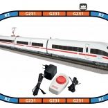 - 4-delige ICE 3 DB AG-trein (1 st), boograils R2 met bedding 55412 (12 st), rechte rails G231 met bedding 55401 (5 st), rechte G231 met voeding 55406 (1 st), bedding voor klem 55447 (1 st), voedingsklem 55270 (1 st), analoge regelaar met voeding 55003 (1 st)