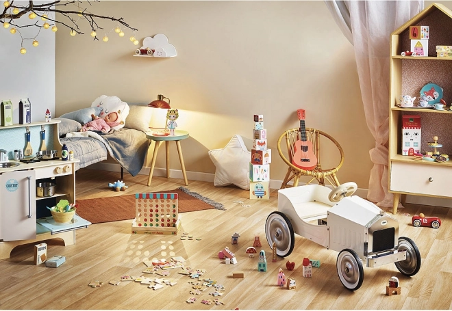 Nauwkeurig vervaardigd van gelakt hout in Frankrijk – een duurzame speelauto met lange levensduur en tijdloos design.