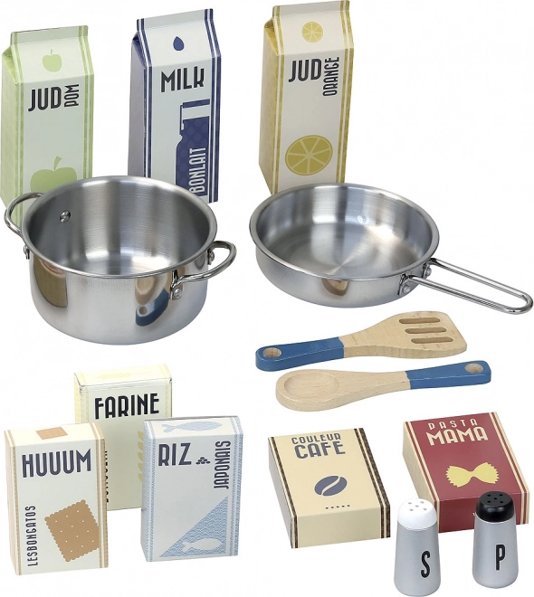 Dankzij de robuuste houten constructie is het keukentje stabiel en duurzaam. Bevat een koksmuts en schort, zout- en peperstrooier, spatel, pan met deksel, koekenpan en etenswaren in tetrapaks – alles klaar voor fantasierijk koken. Na het uitpakken is eenvoudige montage vereist.