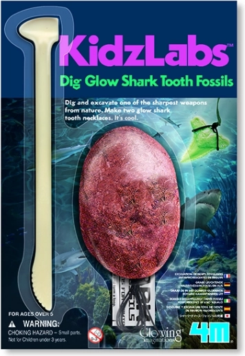 Bevat 2 haaientanden die in het donker gloeien, ingegoten in een gipsblok, een speciaal gereedschap, een koord en instructies.