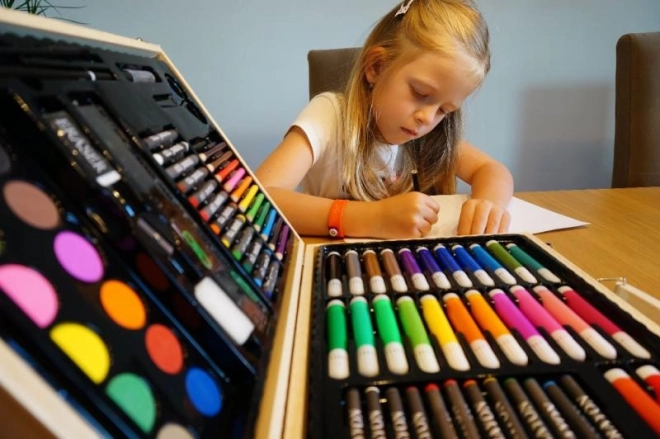 Houten kunstkoffertje dat alle schilders en creatieve mensen zal verrukken. Het koffertje bevat 86 stuks: viltstiften, kleurpotloden, waterverf, waskrijtjes, potloden, liniaal, gum...