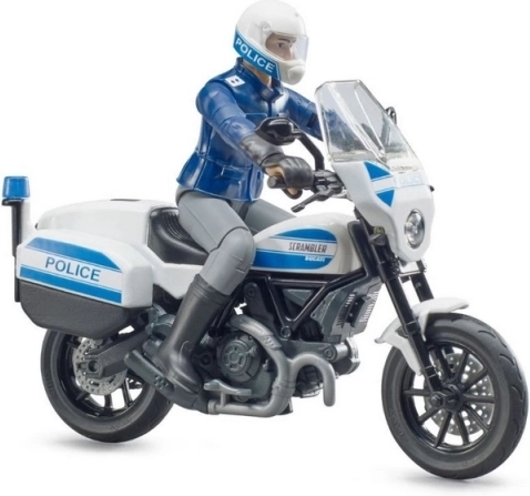 De politiefiets DUCATI Scrambler van Bruder is een verfijnd model voor jonge en oude fans van de hulpdiensten. De motor heeft draaibaar stuur voor eenvoudig manoeuvreren en een uitklapbare standaard voor stabiel parkeren. De politiefiguur heeft beweegbare ledematen, zodat je hem in rijpositie kunt zetten of naast de motor kunt neerzetten.