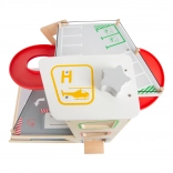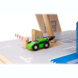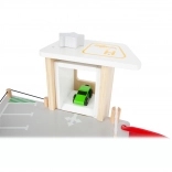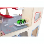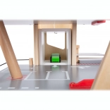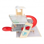 Deze premium parkeergarage van hoogwaardig houten multiplex biedt drie rijk uitgeruste niveaus die met een werkende lift en twee soepele hellingen zijn verbonden. Kinderen kunnen parkeren, tanken, opladen, wassen en repareren – alles op één plek, met realistische elementen en uitstekend speelplezier.