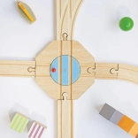 Alle onderdelen zijn gemaakt van stevig en duurzaam rubberhout en afgewerkt met niet-giftige, op waterbasis gemaakte verf. De treinbaan stimuleert de fijne motoriek en de verbeelding en is compatibel met andere treinbanen op de markt.