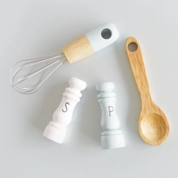 Garde, houten lepel, zoutvaatje, peperstrooier