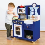 Een stijlvolle kinderkeuken van hoogwaardig hout in koningsblauw met gouden accenten biedt kinderen urenlang creatief en fantasierijk spel. Voorzien van een openende oven, draaiknoppen, gootsteen, magnetron, een schattig raampje met gordijnen en een klok met draaibare wijzers. In de set zitten houten accessoires – garde, houten lepel, zoutvaatje en peperstrooier. Ethisch vervaardigd van duurzaam hout en beschilderd met niet-giftige verf op waterbasis.