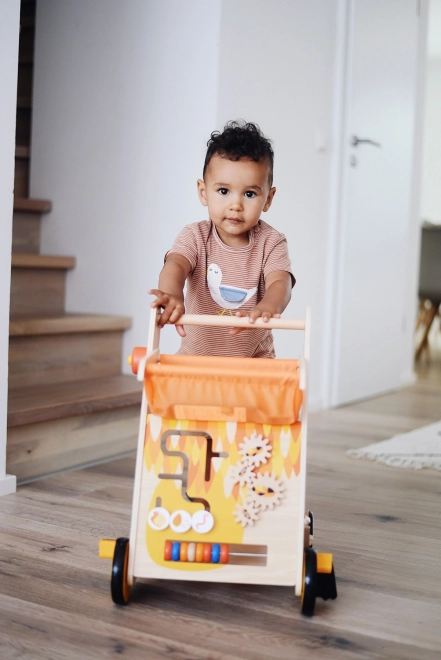 De loopwagen bevat diverse speelelementen zoals vormenstoof, doolhofjes en tandwielen die de ontwikkeling van de fijne motoriek ondersteunen.