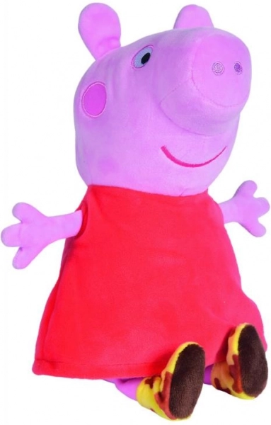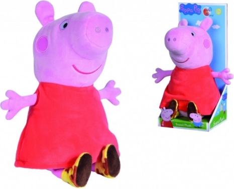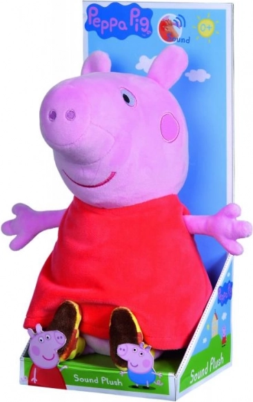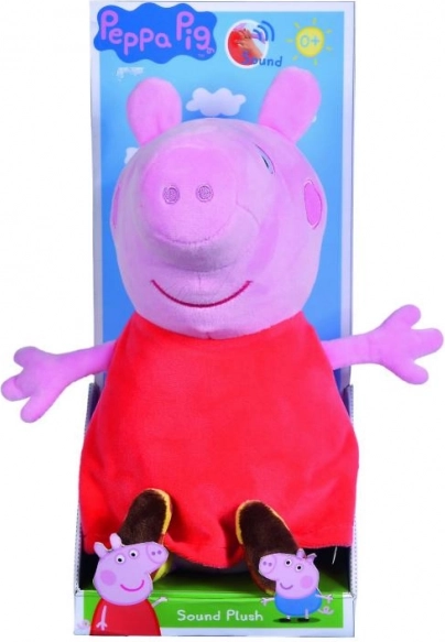 De geliefde heldin uit de serie Peppa Pig als pluchen vriendinnetje met geluid. Druk zachtjes op het buikje en Peppa laat grappige geluiden horen die het speelplezier vergroten en de kinderlijke verbeelding stimuleren. Het zachte materiaal is vriendelijk voor de gevoelige kinderhuid en nodigt uit om te knuffelen.