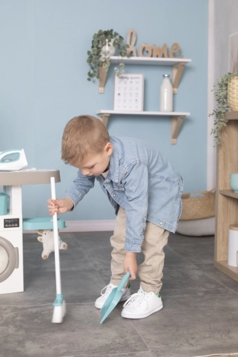 Ook inbegrepen is een volwaardige wasserij: een wasmachine met te openen deur, lade voor wasmiddel en bediening met een knop met “crick‑crack”-effect, plus een droogrek, strijkplank met mechanisch strijkijzer en een wasmand. De uitgebreide set van 36 accessoires omvat servies, bestek, koffiecapsules, zout en peper met “crick‑crack”-geluid, schoonmaakspulletjes en wasaccessoires.