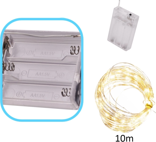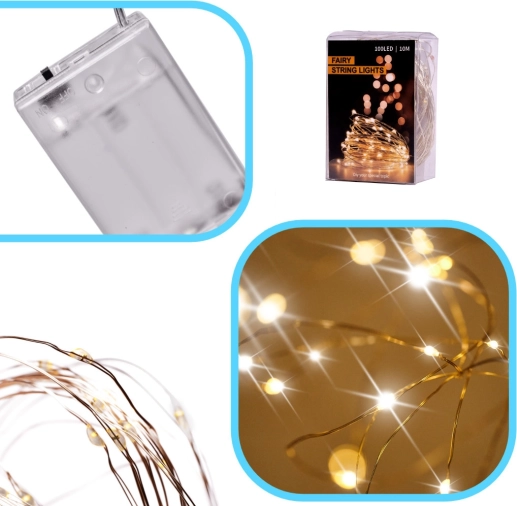Zachte, warmwitte gloed voor een betoverende sfeer thuis en tijdens de feestdagen. 10 meter flexibele draad met 100 LED’s op batterijen verberg je eenvoudig in takjes, flessen of decoraties voor romantische, gezellige verlichting overal zonder stopcontact.