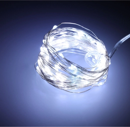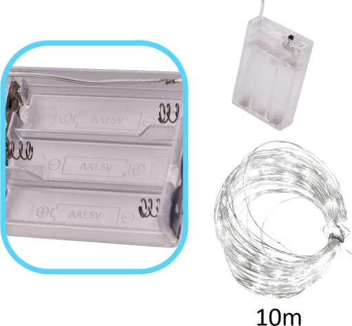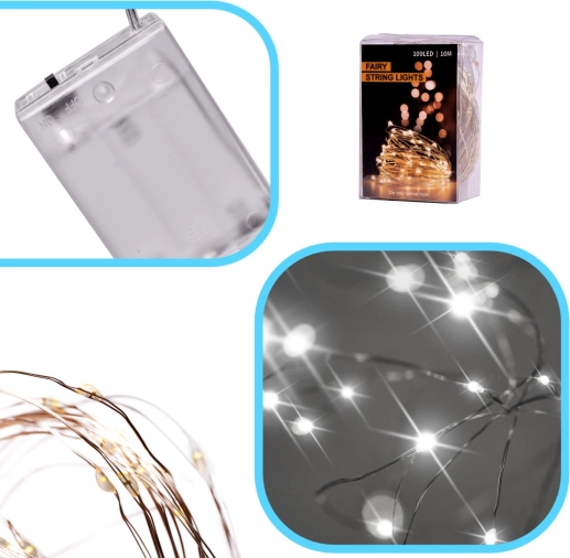 Breng een magische sfeer in huis met een lichtsnoer van 10 m met 100 LED’s. De flexibele draad verberg je eenvoudig in takjes of decoraties en creëert een subtiele, ijswitte verlichting. Dankzij de batterijvoeding plaats je ze overal – zonder kabels en stopcontacten.