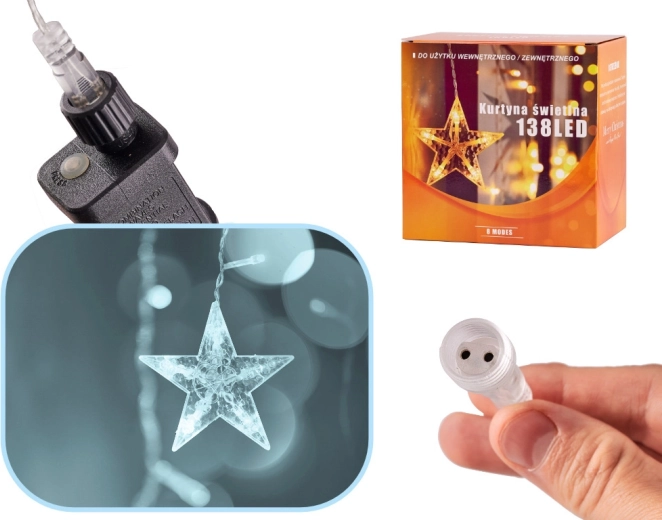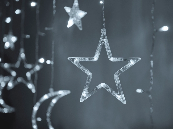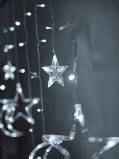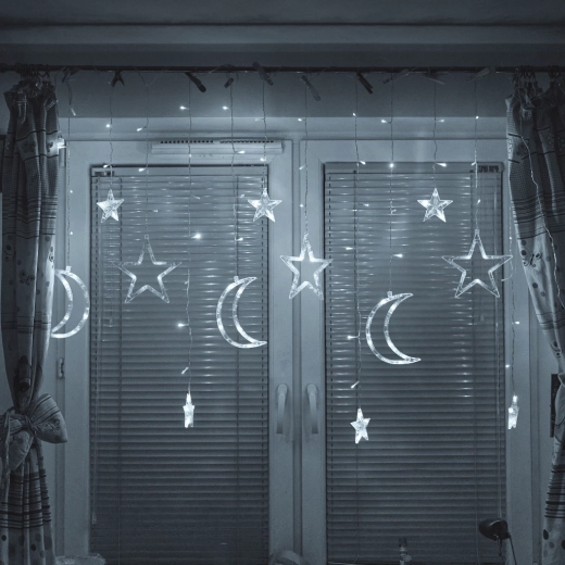 Creëer thuis een magische sfeer met dit hangende LED-gordijn met maan- en sterrenmotief. Het biedt een elegante koudwitte kleur, 8 lichtmodi en netvoeding voor een onafgebroken schittering. Dankzij 138 LED's en de IP44-bescherming is het ideaal als kerst- én jaarronde decoratie voor de woonkamer, slaapkamer of kinderkamer.