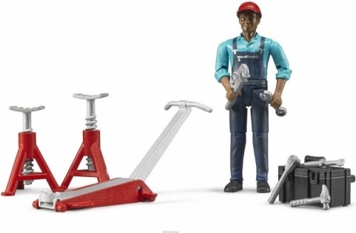 De set bevat een monteurfiguur met beweegbare ledematen en werkplaatsaccessoires (hamer, schroevendraaier, krik en meer), waarmee reparaties en service aan de tractor kunnen worden gesimuleerd. Het model is gemaakt van duurzaam ABS-kunststof en polycarbonaat, wat een lange levensduur garandeert, zelfs bij intensief gebruik.