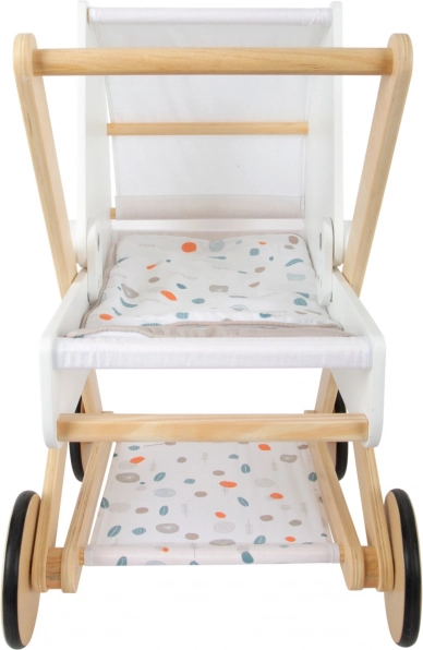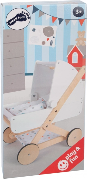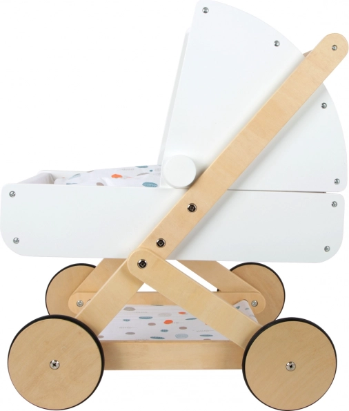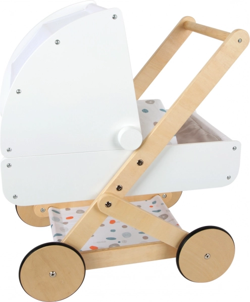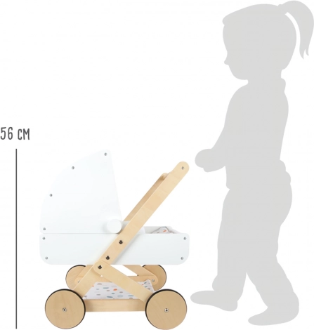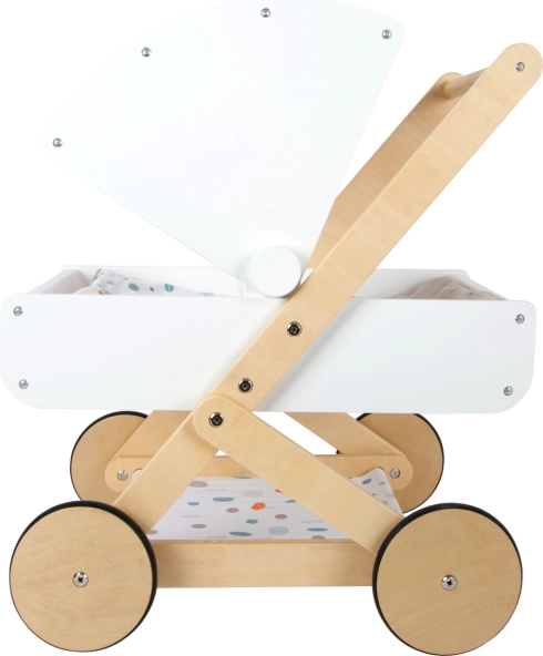 Stijlvolle houten poppenwagen uit de Little Button-collectie van small foot, met een Scandinavisch design, stille rubberen wielen en een praktische opbergruimte onder het bedje. Dankzij de 2-in-1 kantelbare kap kunnen poppen en knuffels tot 46 cm zowel naar voren als naar achteren kijken, terwijl het tweezijdige, genderneutrale beddengoed maximaal comfort biedt.