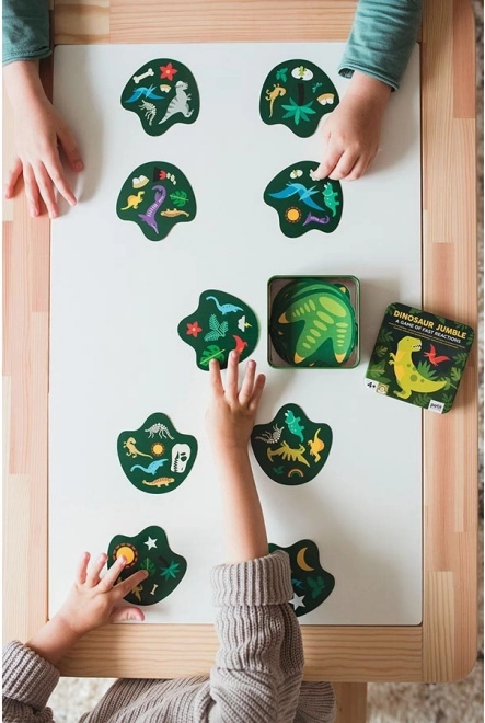 Train je reactievermogen met dinosaurussen. Dit kaartspel biedt tot vijf spelvarianten en zit vol kleurrijke illustraties met dinosaurus-thema. Je zult het zeker ook snel waarderen vanwege het compacte formaat, geschikt om thuis en onderweg te spelen. Verpakt in een metalen blikje zonder gebruik van plastic. Belangrijkste kenmerken voor 2–6 spelers 5 varianten van spelregels praktische verpakking Spelregels: Basisvariant: Deel aan elke speler één kaart met de afbeelding naar beneden. Plaats de stapel met de afbeelding naar boven tussen de spelers. Op een afgesproken signaal draaien de spelers hun kaarten om. De speler die als eerste het identieke symbool op zijn kaart en op de kaart van de stapel noemt, neemt de kaart van de stapel. Zo wordt de stapel uiteindelijk opgemaakt en de winnaar is de speler met de meeste kaarten. Omgekeerde variant: Verdeel de kaarten onder de spelers zodat iedereen hetzelfde aantal kaarten heeft en er één kaart overblijft. De spelers leggen hun kaartenstapel voor zich met de afbeelding naar beneden. Leg de overgebleven kaart met de afbeelding naar boven tussen de spelers. Op een afgesproken signaal draaien de spelers de bovenste kaart van hun stapel om. Wie als eerste het symbool noemt dat overeenkomt met zijn kaart en de kaart tussen de spelers, legt zijn kaart op de groeiende stapel in het midden en draait vervolgens zijn volgende bovenste kaart om. Het spel gaat zo door totdat er één speler met kaarten overblijft; die is de verliezer. De speler die als eerste al zijn kaarten heeft weggespeeld, is de winnaar. Groepsvariant: Er wordt in rondes gespeeld. In elke ronde krijgt elke speler één kaart met de afbeelding naar beneden. Op een afgesproken signaal draaien de spelers hun kaart om; wie als eerste een symbool noemt dat overeenkomt met het symbool op de kaart van een andere speler, geeft zijn kaart aan die speler. Het spel gaat door totdat één speler alle in die ronde uitgedeelde kaarten ontvangt. Het doel is om van je kaarten af te komen; de speler die in totaal over de rondes de meeste kaarten ontvangt, is de verliezer.