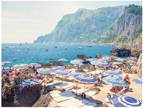 Geniet van het iconische uitzicht van boven: turquoise zee, kleurrijke parasols en een schilderachtige kust die zowel oog als ziel streelt.