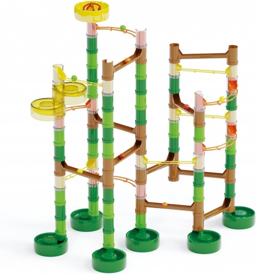De Migoga Jungle knikkerbaan biedt kinderen vanaf 4 jaar leerzaam speelplezier. Gekleurde knikkers starten gelijktijdig en volgen daarna verschillende routes vol bruggen, spiralen en glijbanen, geïnspireerd op junglevormen. Kinderen kunnen bouwen volgens de instructies of volledig originele constructies maken.
