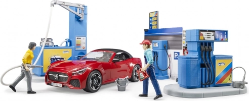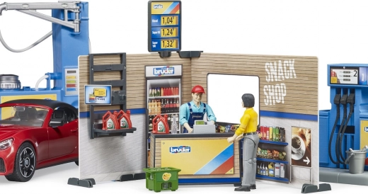 Inclusief een veelzijdige sportauto met afneembare wielen en dak, volledig compatibel met figuren en accessoires van BRUDER BWORLD. Dubbelzijdig bedrukte achtergronden, schappen met jerrycans en een prijslijst stimuleren creatief en leerzaam spel.