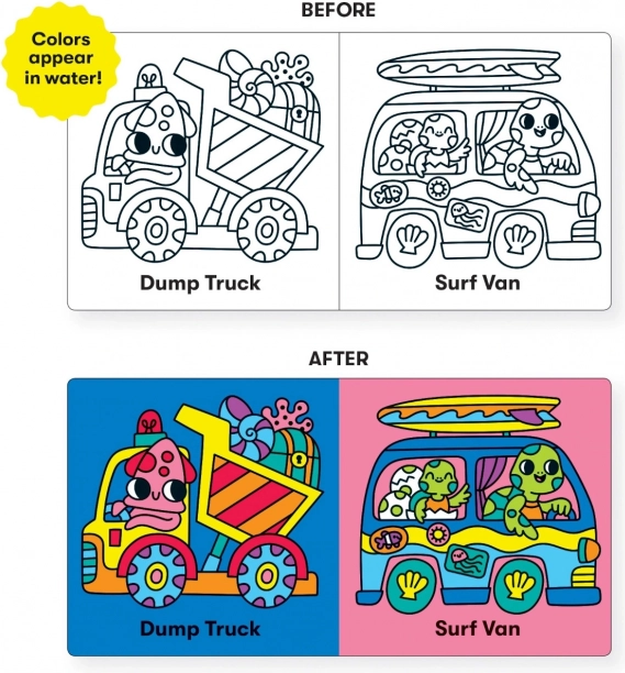 • Interactief kleureffect – de afbeeldingen lichten op en worden zichtbaar zodra ze nat worden.