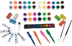 De set bevat diverse hulpmiddelen zoals kleurpotloden, markers, oliekrijtjes, verf en penselen, wat creatief uitdrukken bevordert.