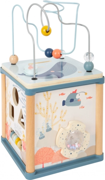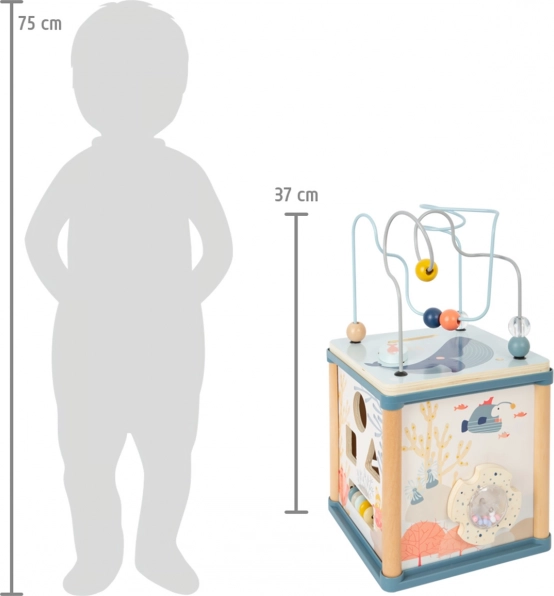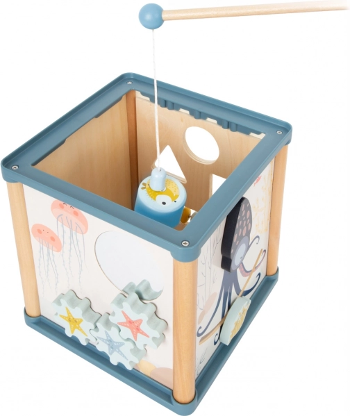 Deze houten activiteitenkubus met onderwaterwereld-thema biedt vijf zijden vol activiteiten en bovendien een leuk magnetisch hengelspel – de stukjes uit de vormenstoof kunnen met het magnetische hengeltje direct ín de kubus worden gevangen. Kleurrijke illustraties van zeedieren stimuleren het visuele waarnemen, terwijl de veerkrachtige octopus een speels element toevoegt dat kinderen motiveert om verder te ontdekken.
