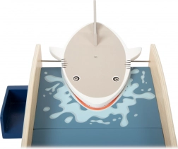 Een leuke houten minigolfset met een haai die kinderen aanzet tot bewegen en hun coördinatie ontwikkelt. Laat het balletje over de “golf” rechtstreeks de bek in rollen – raak je doel, dan klappen de kaken spectaculair dicht en rolt het balletje via een opening terug het spel in. Inclusief 2 clubs en 4 gekleurde balletjes van robuust hout.