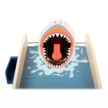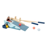 Verander elke kamer of tuin in een mini-golfbaan! De houten minigolf met haaienbek biedt kinderen actieve fun en training van de grove motoriek, oog-handcoördinatie en geduld. Laat het balletje over de blauwe helling als over een golf naar de open bek rollen – bij een treffer sluit de haai zijn bek en vier jij je score.