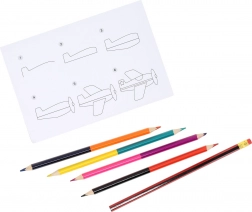 • Complete uitrusting: tekenonderlegger, 4 dubbelzijdige kleurpotloden (8 kleuren) en een potlood met gum.