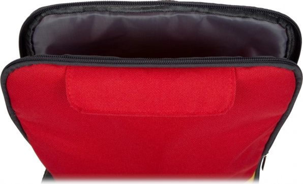 De rood-gele rugzak heeft een dubbele rits voor snel openen, verstelbare schouderbanden voor comfortabel dragen en twee gespen voor het bevestigen van accessoires. Houten en kunststof onderdelen liggen prettig in de hand en zijn bestand tegen intensief spelen.